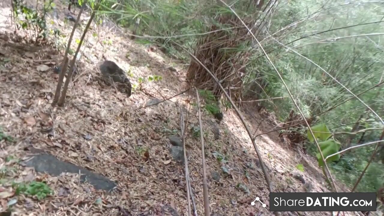 A young Thai couple ventures into the jungle for a steamy outdoor encounter, culminating in a creampie and orgasmic finish amidst the lush greenery.