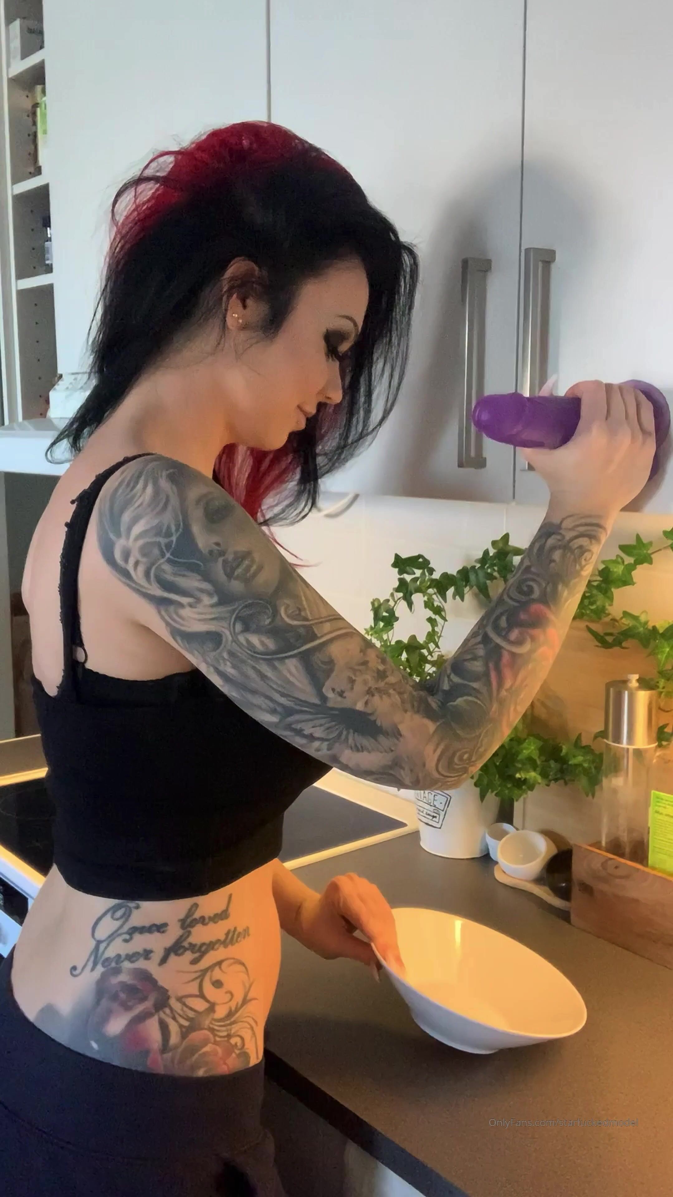 startfuckedmodel uses her purple dildo to open the cupboard door to get a plate out on onlyfans fans