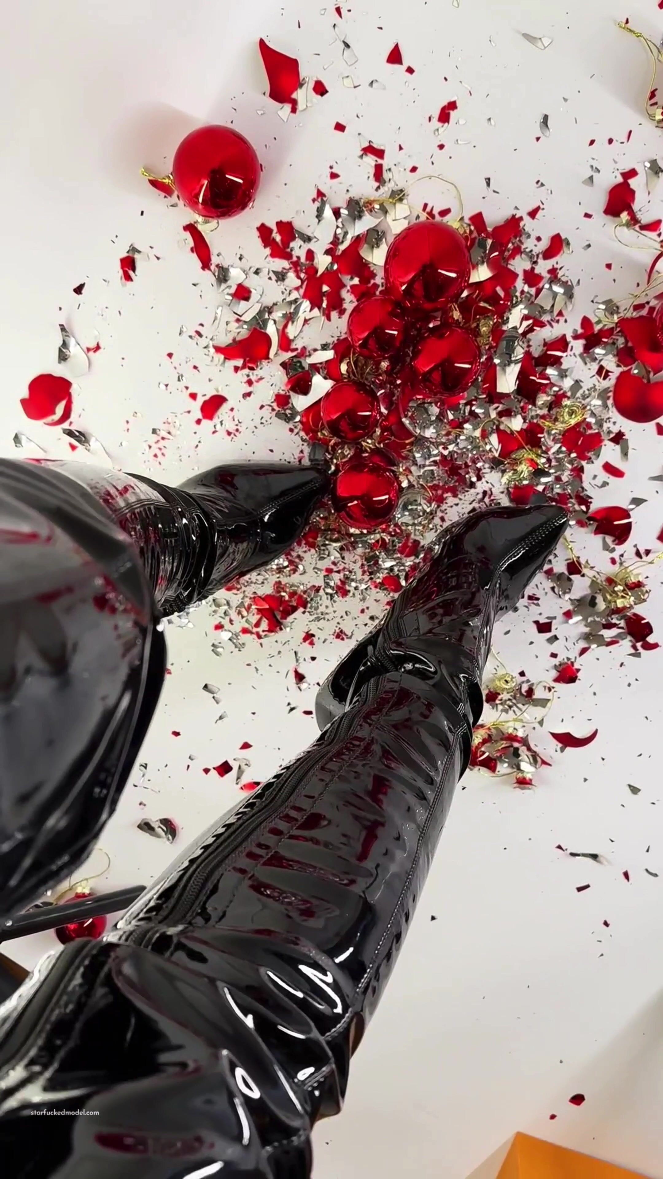 starfuckedmodel crushing christmas baubles in black shiny boots on onlyfans